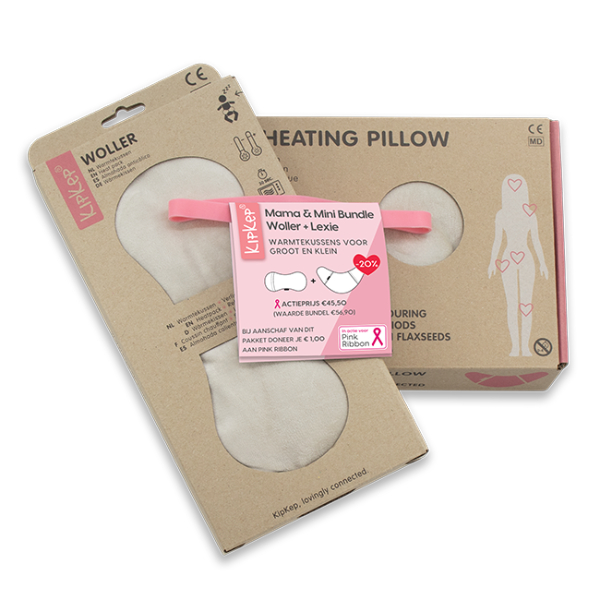 Een Woller warmtekussen voor je baby & een Lexie Heating Pillow voor jezelf. Dubbel voordeel: warmte en ontspanning voor moeder én baby, én samen bijdragen aan borstkankeronderzoek.