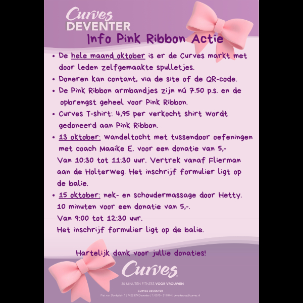 ... want 1 op de 7 vrouwen in Nederland krijgt borstkanker. Pink Ribbon is er voor al deze vrouwen. Ik kom in actie om geld op te halen voor belangrijk borstkankeronderzoek. Steun jij mij met een donatie? Samen bereiken we meer! Namens mijzelf en PinK Ribbon: Dankjewel!