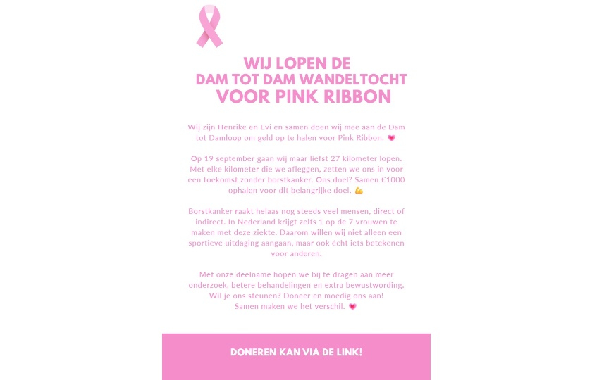 Wij zijn Henrike en Evi en samen doen wij mee aan de Dam tot Damloop om geld op te halen voor Pink Ribbon. Met elke kilometer die we lopen, zetten we ons in voor een toekomst zonder borstkanker.